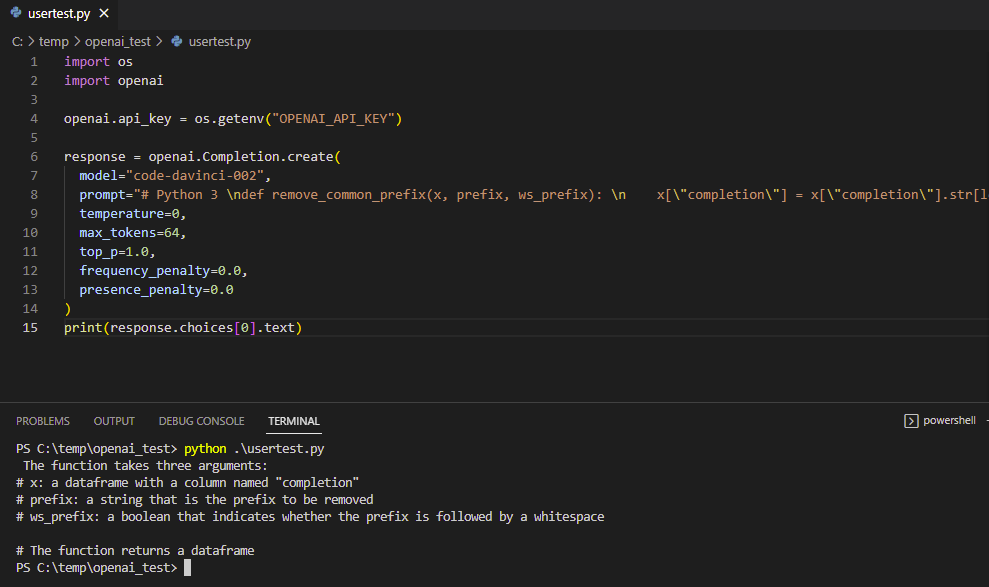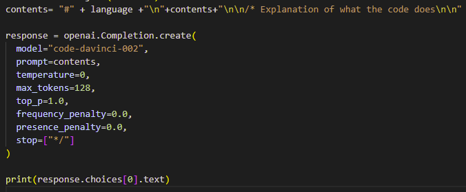 OpenAPI’s documentation is excellent, so it only took another few minutes to find an example of what I was after – a quick way to explain what a given function is doing. Disclaimer, it’s actually using their code-davinci-002 engine instead of the ChatGPT engine, but the more precise the better IMHO.