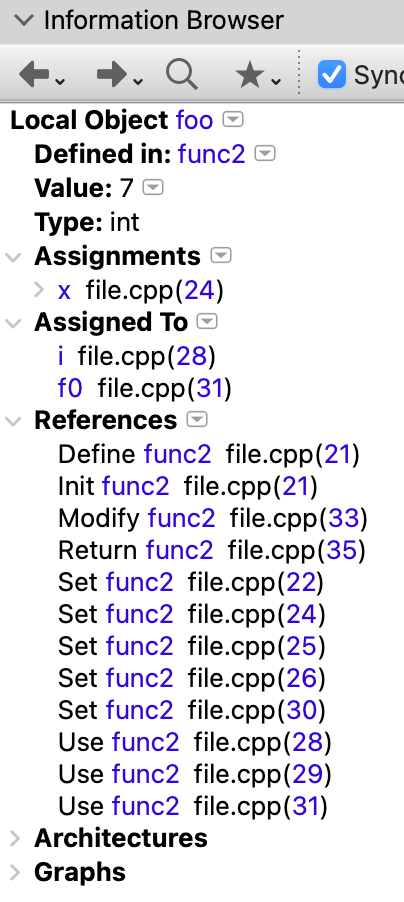 You might notice some limitations with the “Assignments” and “Assigned To” sections. Because references link one entity to a second entity, assignments to data (foo = 6), multiple entities (foo = y + z), or expressions (int j = 2*foo) don’t have references. Assign references also don’t work for return value of a function call (foo = func1(y,y+7,y)). But, they do catch parameters, like f0 on line 31. In fact, the reference kind even distinguishes between assignby value and assignby ref.
