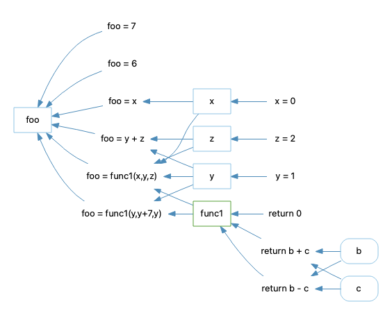 - The “Assigned To” section tells us that on line 28 i=foo, and on line 31 f0=foo.