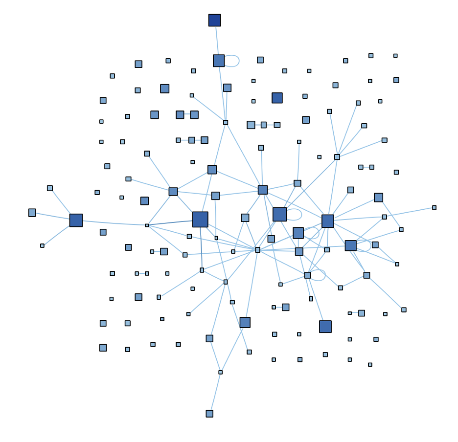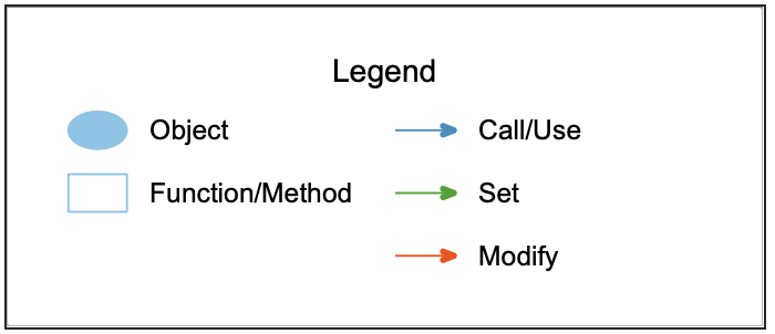 To keep objects and functions straight, I’ll have functions be squares and objects be circles. This follows the convention in most other Understand graphs, like “Object References”. While I’m following conventions, I’ll go ahead and use the same colors for edges as” Object References”, so calls and uses are blue, sets are green, and modifications are orange.
