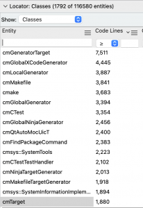 Time for the fun part. Let’s see how the graph works. I want to try files or classes that are big enough to be interesting. So, from my CMake project, I’ll open the entity locator and sort the classes by lines of code. Then I can try my graph out on the biggest classes.