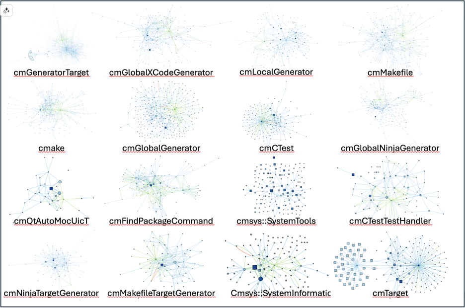The main reason I changed my mind about spaghetti graphs is the natural clustering. I expected spaghetti graphs to be, well, like a plate of spaghetti. So many twisty edges in a big ball that nothing stood out as useful. In my defense, there are projects with “File Dependencies” graphs like that. But many projects, like CMake, have several distinct clusters.